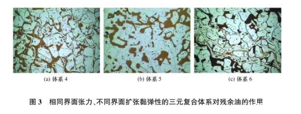 图3相同界面张力、不同界面扩张黏弹性的三元复合体系对残余油的作用