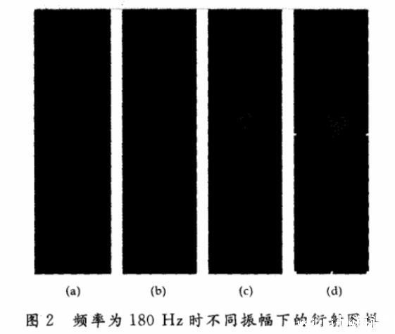 调整好实验参数,我们采集表面张力波的激光衍射图样。图2为频率为180 Hz的表面张力波在不同振幅下采集的图样。从图2中可看到衍射条纹十分清晰、稳定,条纹的对比度非常高。