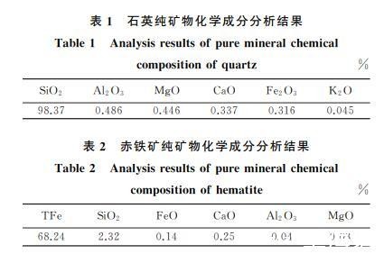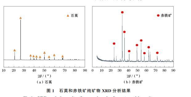 由表1可知,石英纯矿物样品中SiO2含量为98.37%,样品中含有少量Al、Mg及其他微量元素,因此石英样品可视为纯矿物,满足试验要求。由表2可知,赤铁矿中TFe含量为68.24%,样品中含有少量Si及其他微量元素,杂质含量较少,因而赤铁矿样品可视为纯矿物。