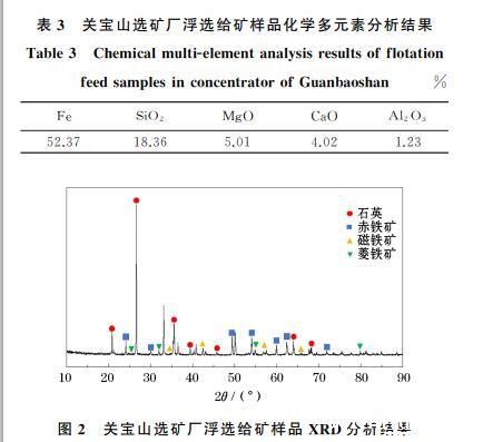 试验所用矿石为关宝山铁矿,具有矿物组成复杂、嵌布粒度细、分选难度大等特点。关宝山选矿厂浮选给矿样品经自然阴干后进行混匀缩分取样,其化学多元素分析结果见表3.由表3可知,浮选给矿中Fe含量为52.37%,脉石矿物以含硅矿物为主,SiO2含量为18.36%;其次为含钙及含镁矿物,MgO、CaO含量分别为5.01%、4.02%.关宝山选矿厂浮选给矿样品XRD分析结果如图2所示。由