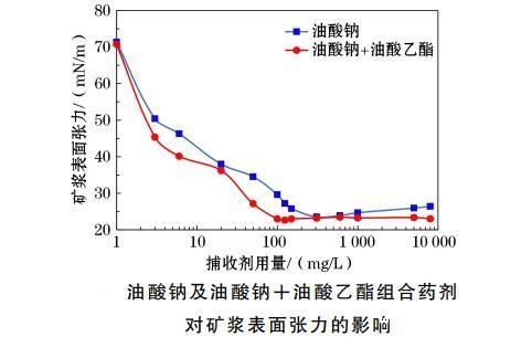 图3油酸钠及油酸钠+油酸乙酯组合药剂对矿浆表面张力的影响