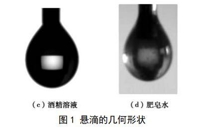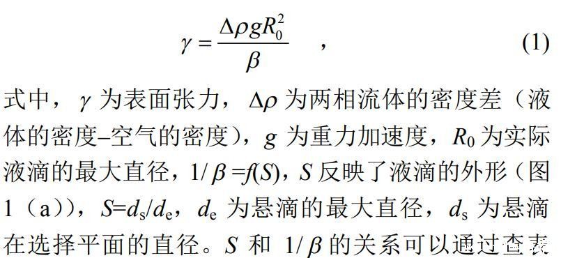 试验为比较3种液体表面张力的大小,采用悬滴法对液体的表面张力进行测量,悬滴法的基本原理是:处于毛细管端液体悬滴的形状与液体的表面张力有关,在重力作用下,毛细管端形成的球形液滴的形变,随着液滴有效密度的增加而增加并随着液滴界面张力的增加而减小。通过Young–Laplace方程可以推导得到悬滴法计算表面张力的基本方程: