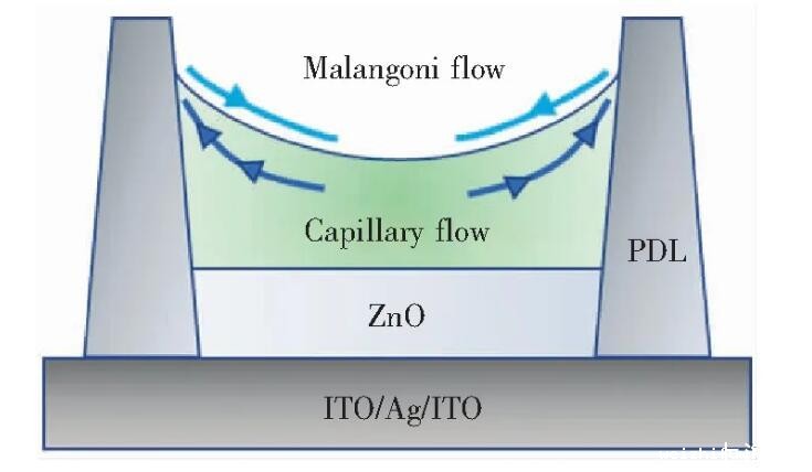 量子点的成膜形貌与墨水配方密切相关。与平面上成膜容易产生咖啡环类似,在像素结构中量子点容易形成边缘堆积的薄膜形貌。为了使量子点从边缘迁移到像素坑中心,需要增大液滴内部自外而内的马兰戈尼流。