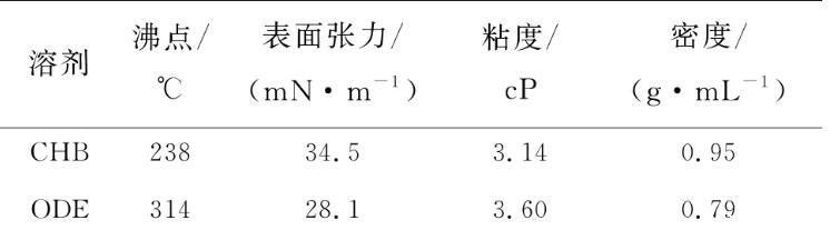 表1为CHB和ODE的沸点、表面张力等物理参数,在选择量子点溶剂时,利用了双溶剂体系增强马兰戈尼流的基本原理。CHB是一种沸点较低、表面张力较高的溶剂,而ODE则是沸点高、表面张力低的溶剂,可以有效地增强自外而内的马兰戈尼流;同时两种溶剂的粘度都较低,并且对量子点都有较好的溶解性。