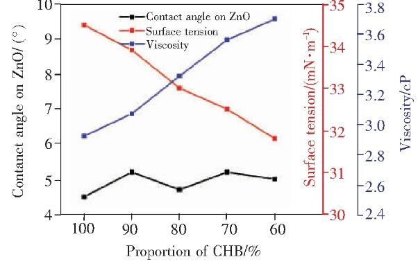 图1不同比例墨水的表面张力、粘度和在ZnO上的接触角。