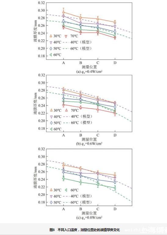 在加热条件下,由于液体入口温度不断提升以及流经正在加热壁面上,液膜将会产生水蒸气冷凝在探针头部,从而影响通过摄像机观测液膜气液界面的判断。本实验中,在探针底部粘贴一块直径为9mm的陶瓷加热片,在加热倾斜壁面的同时也加热探针,避免水蒸气凝结在探针头部影响对液膜厚度的测量。为了观测到倾斜加热壁面上液膜出现干斑现象,减小去离子水的喷淋密度,但仍然确保液膜能够完全铺展在壁面上。图8展示了在壁面倾斜角度为15°、喷淋密度为0.016kg/(m·s)的条件下,不同热流密度和入口温度对各测量位置液膜厚度变化的影响,并与模型计算值进行了对比。当入口温度为70℃、热流密度qw=0.8W/cm2时,液膜厚度变化消失,由于加热壁面出现了干斑。