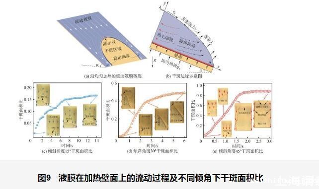 图9液膜在加热壁面上的流动过程及不同倾角下干斑面积比