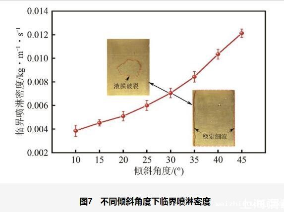 从图7中可以看出,在较低的倾斜角度(如10°~25°)下,液膜受重力在壁面平行方向分量的影响较小,主要依靠喷淋液体的动能和润湿性来维持覆盖。此时,液膜较厚,表面张力对毛细波动的抑制作用较强,能够有效抵御扰动,流动较为稳定,因此临界喷淋密度较低。然而,在较高的倾斜角度(如30°~45°)下,重力在流动方向的分量显著增强,液膜受到更大的重力驱动力作用,易发生滑移和局部脱离壁面现象。同时,倾斜角度增大会使液膜变薄,液膜内剪切力增大,进一步放大表面张力波动对扰动的响应,从而导致液膜对扰动的敏感性提高,流动不稳定性显著增强。此外,局部区域的液膜破裂会导致液膜整体失稳,最终在两侧形成稳定细流。因此,为了维持液膜的完整性和连续性,需要提高喷淋密度以抵消重力和表面张力波动的破坏作用,从而导致临界喷淋密度在高倾斜角度下显著升高。
