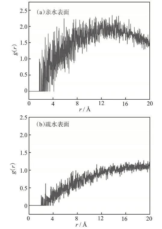 为了进一步揭示鼠李糖脂分子与亲水、疏水表面之间的相互作用以及成键模式,计算了鼠李糖脂分子与不同润湿性表面的径向分布函数[g(r)]。计算以动力学模拟1000 ps后的稳定结构为基础,结果如图5所示。对于亲水表面,鼠李糖脂分子距离1.3~2.0Å的范围内出现了明显的峰,表明分子与该表面在此范围内有新键生成,作用力较强。这主要是由于亲水表面的羟基基团与鼠李糖脂亲水环之间存在氢键作用。2.0Å之后的峰主要由范德华力和静电作用形成,从而产生了较高的吸附结合能(E=29.7 eV)。对于疏水表面,g(r)在2.0Å之内均没有明显的峰,说明疏水表面与鼠李糖脂分子之间并没有氢键生成,只有范德华力和静电相互作用等弱作用力。这是由于疏水表面的十八烷基长链分布松散,与鼠李糖脂分子的相互作用较弱,在界面处疏水基团与鼠李糖脂分子间形成薄层空隙,导致结合能较低(E=12.2 eV)。
