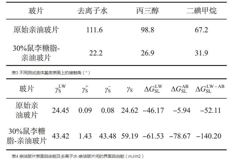 表4亲油玻片表面自由能及去离子水-亲油玻片间的界面自由能(mJ/m2)