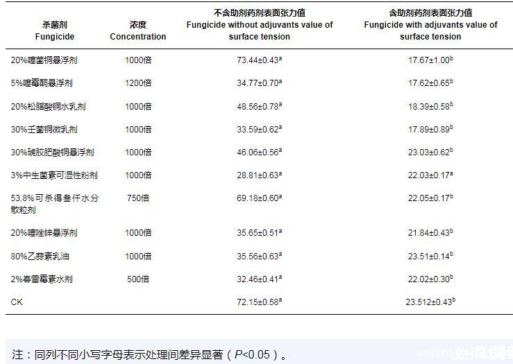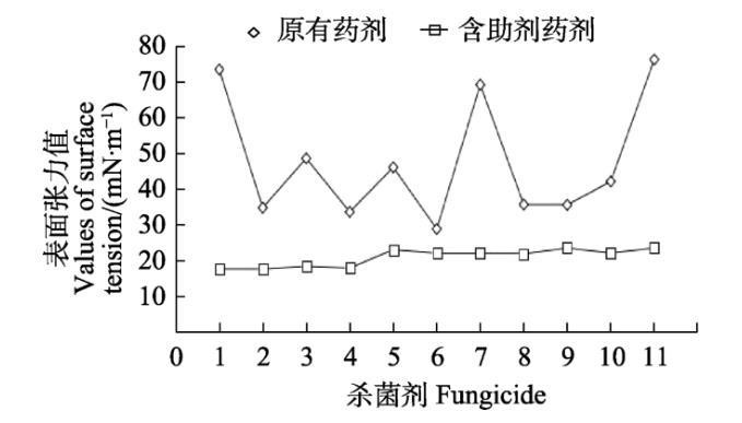 参照各供试杀菌剂田间推荐剂量,分别配置10 mL药液2组,其中一组添加助剂,一组不含助剂。通过表面18luck国际测试各药液的表面张力值。每组设置3个重复,以水作为空白对照。