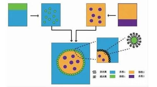 越复杂的功能需求往往越需要复杂的结构体系来支撑。相较于单腔室乳液,多腔室乳液无论是在功能性成分的包封方面,还是在输送及释放方面都存在十分明显的优势,且许多研究表明多腔室乳液的稳定性可以得到保证,这无疑为食品行业发展提供了新的方向,可以通过制备更具结构复杂性的内外多腔室等级乳液来满足市场上愈加多样化的需求。乳液的制备通常需要3个步骤:第1步制备出O1/W1型乳液液滴,第2步是制备W2/O2型乳液,最后是以O1/W1乳液液滴为稳定剂制备得到具有内外多腔室和等级结构的多重乳液((O1/W1)/O2/W2),如图所示。乳液的稳定性主要是靠制备乳液液滴的乳化剂在油-水界面的自组装作用、油相添加量、乳液液滴浓度等几种因素之间的相互作用来决定的。