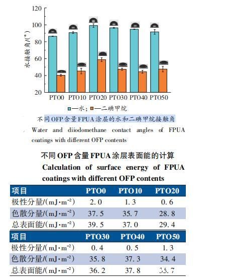 结果讨论部分显示,随着OFP含量的增加,涂层的凝胶率逐渐降低。相比于不含氟的PTO0树脂98.6%的凝胶率,PTO40的凝胶率只有81.5%,证明OFP结构的引入降低了聚合物的稳定性。这是因为OFP作为封端剂,其含量的增加会导致同样用于封端的HEMA用量降低,而提供光固化基团的HEMA用量减少导致碳碳双键的密度降低,光固化后的交联结构的稳定性也随之降低。FPUA涂层的吸水率随OFP含量的增加而降低,说明添加OFP使涂层的耐水性得到了提升。这主要归功于OFP自身较低的表面张力,降低了涂层的表面能,水在其表面不易铺展开,水分子更难进入到材料内部,进而提高了材料的耐水能力。