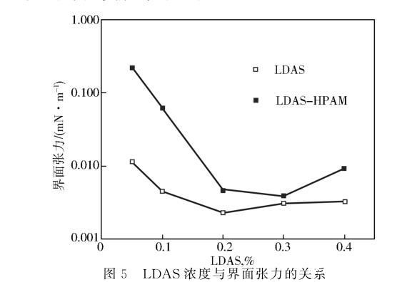 由图5可知,无论溶液有无聚合物存在,随着复配表面活性剂LDAS浓度的增加界面张力呈现先下降而后略有增加的现象。无聚合物时,活性剂LDAS浓度在0.1%~0.4%时界面张力均处于超低界面张力范围;加入0.12%HPAM后,油水界面张力略有上升,但0.2%和0.3%LDAS溶液与魏岗原油间的界面张力仍然很低,分别为0.003 8 mN/m和0.004 5 mN/m,表明复配表面活性剂体系具有很高的界面活性。