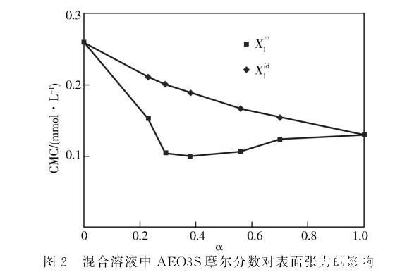 图2混合溶液中AEO3S摩尔分数对表面张力的影响