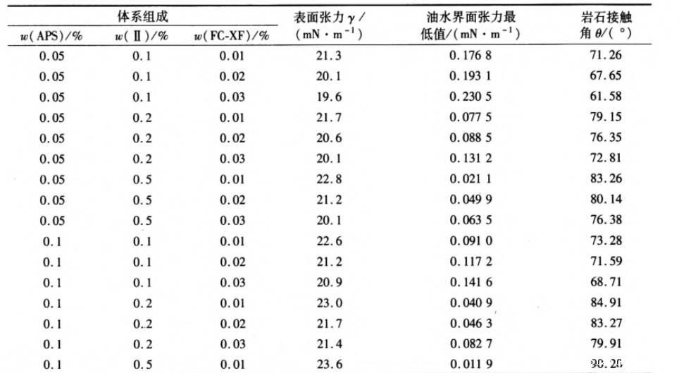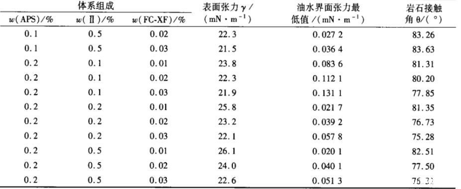 表1体系组成和含量对APS/Ⅱ/FC-XF混合体系界面性能的影响