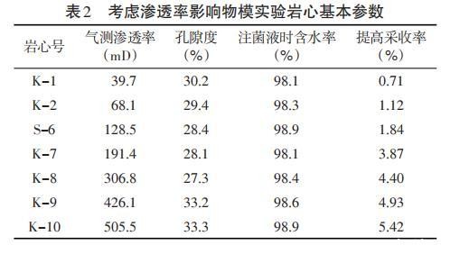 (2)效果评价及影响因素分析岩心注入0.1PV菌液,室温放置7d后,不同渗透率油藏环境对微生物提高采收率影响显著,由实验结果显示(表2),岩心渗透率从39.7mD升高至505.5mD,微生物提高采收率从0.71%升高至5.42%,随着渗透率的增加,微生物驱油提高采收率幅度增大。