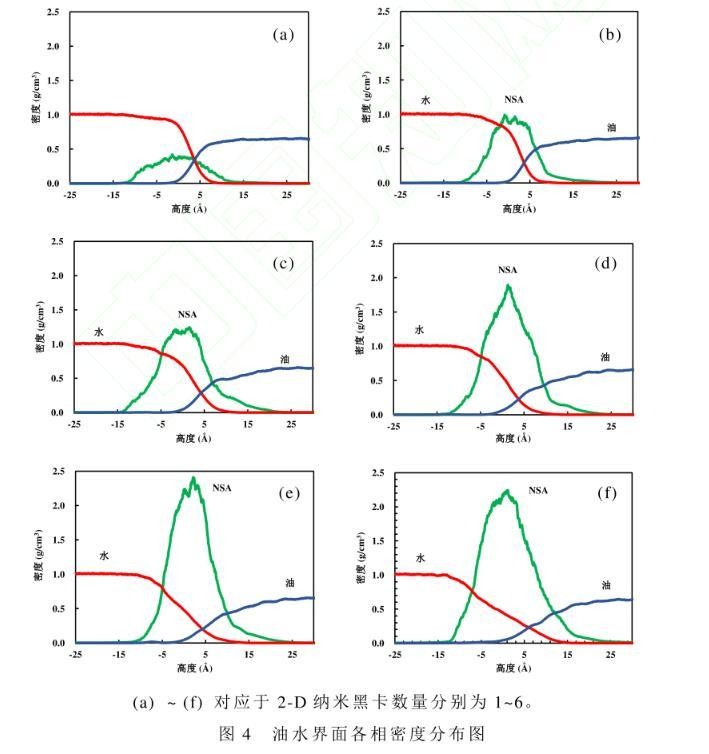 运用所构建的油水界面模型,研究2-D纳米黑卡(NSA)在油水界面的密度分布及吸附行为,模拟结果如图4所示。纳米黑卡数量增加时,界面处油相密度变化幅度大。这是由于随着纳米黑卡数量的增加,接枝的直链烷烃与油相相互作用不断增强所致。当体系达到平衡状态,纳米片大部分浸没在水相中,直链烷烃主要浸没在油相中。此时,纳米黑卡所处的平衡位置受到纳米黑卡重力和分子间相互作用力的影响很大,分子间相互作用力包括范德华力和静电力。纳米片偏亲油性,显示出与油水分子间的弱范德华力,而直链烷烃与油相分子间存在强范德华力,因此纳米片被拉向油相。随着纳米黑卡数量的增加,油水界面纳米片的密度随之增加。纳米黑卡的密度在中线附近出现峰值,当纳米黑卡数量增至4片后继续增加黑卡数量,在中线部分纳米黑卡的密度增加量并不明显,只是高峰变宽了。