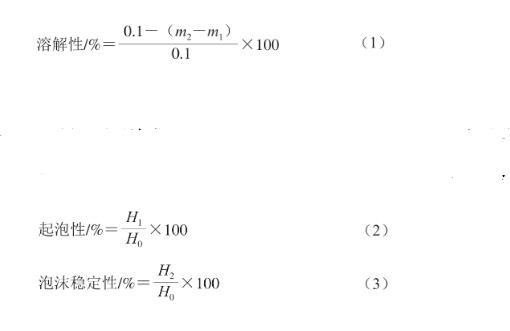 样品分散于蒸馏水中制成质量浓度为1 g/100 mL的蛋白溶液。取20 mL样品溶液放置于50 mL烧杯中,记录初始高度(H0),以13 500 r/min高速间歇搅打2 min,立刻记录此时泡沫高度H1,室温下静置30 min后的记录泡沫高度H2。起泡性和泡沫稳定性按照式(2)、(3)计算: