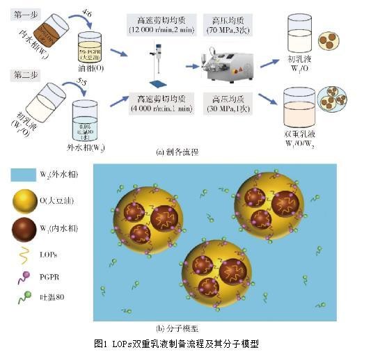 通过两步法制备双重乳液,制备流程及分子模型见图1。操作步骤:将内、外水相及油相搅拌15 min,混匀后于4℃避光贮藏12 h备用;第一步,将质量分数为20%的LOPs水溶液作内水相,内水相与油相的质量比为4∶6。将内水相加入含有PGPR(质量分数为5%)的大豆油中,先经高速剪切机(12 000 r/min,2 min)混合后,再经高压均质机在70 MPa条件下循环3次,获得W1/O初乳液。第二步,将质量分数为0.8%的吐温80水溶液作外水相,W1/O乳液与外水相的质量比为5∶5。将W1/O乳液加入外水相后,再用高速剪切机(4 000 r/min,1 min)混合,并经高压均质机在30 MPa的条件下均质1次,获得LOPs的W1/O/W2型双重乳液,于4℃条件下存储。