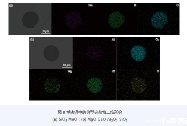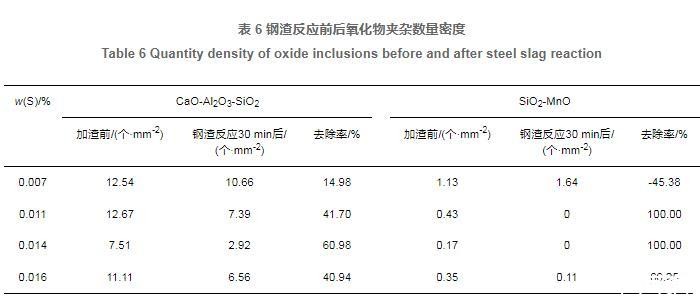 分析钢渣反应前后夹杂物的成分可知,重轨钢中氧化物夹杂分为SiO2-MnO系和CaO-Al2O3-SiO2系两类夹杂,图8所示为两类典型夹杂二维形貌。各类氧化物夹杂在钢渣反应前后数量密度变化见表6。可以看出,钢中主要夹杂为钙铝硅酸盐,因此钢渣反应30 min后,钙铝酸盐的去除率同总氧化物夹杂的去除率相近,随着氧、硫质量分数的增高,钙铝酸盐的去除率呈升高的趋势。由于钢中硅锰夹杂数量较少,且扫描面积有限,仅从以上表格统计的数量密度不具代表性,因此其去除率未呈现明显规律。