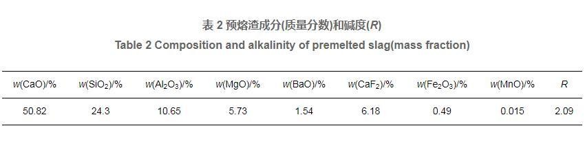 研究钢液中氧含量对夹杂物去除的影响时,需待试验钢熔清后加入质量分数为99%的Fe2O3以提高钢中氧元素质量分数。所加试剂熔化且均匀后(反应10 min),立即抽取石英管样1并水冷,随后向钢中加入提前预熔粉碎好的渣料(渣量为钢液质量的15%),成分见表2。钢渣反应30 min后取石英管样2并水冷。
