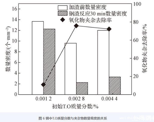 图6钢中T.O质量分数与夹杂物数量密度的关系