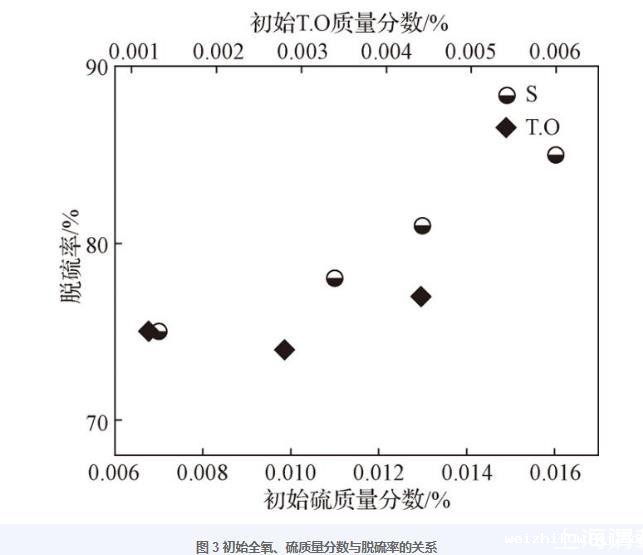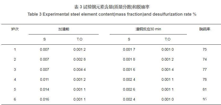 检测每炉试样1和试样2的硫和全氧质量分数,结果见表3。可以看出,固定钢中全氧质量分数,随着初始硫质量分数的升高,钢渣反应30 min后,脱硫率逐渐增大,且稳定在74%以上,终点硫质量分数可降低到0.002 6%以下;固定钢中硫质量分数,随着初始全氧质量分数的升高,终点全氧质量分数可降低到0.001 4%以下,终点硫质量分数可降低到0.001 8%以下,皆满足重轨钢的成分要求。钢中初始硫、全氧质量分数与脱硫率的关系如图3所示。