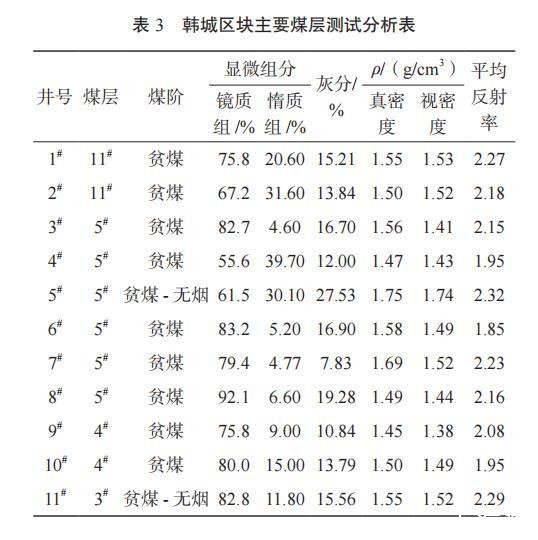破碎程度可以通过测井资料来判断,煤层的声波小,密度大,则煤层的破碎程度不高,整体性好;反之声波大,密度小则煤层破碎程度高,松散,呈碎煤或碎粒煤;测井曲线反映煤层的声波时差一般在370~410μs/m、密度测井值为1.28~1.7g/cm³。表4为韩城区块主要目的层声波时差、密度测试分析结果,可以看出韩城区块声波偏高、密度中等,说明其煤层整体表现破碎程度较高、整体性较差。
