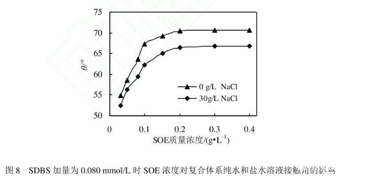 测试发现十二烷基苯磺酸钠(SDBS)在纯水溶液中的ccmc为0.5 mmol/L(0.174 g/L),该浓度下溶液的表、界面张力分别为27.06 mN/m和0.18 mN/m;SDBS在30 g/L NaCl溶液中的ccmc为0.080 mmol/L(0.028 g/L),该浓度下溶液的表、界面张力分别为27.62 mN/m和0.21 mN/m。因此,选择与SOE复合的SDBS的浓度为0.08 mmol/L。