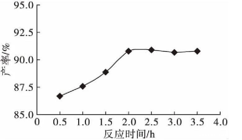 由图3可以看出,随着反应温度逐步升高产物产率也逐步增大,在35℃时产物产率达到最大值,之后反应温度再升高产物产率逐步下降。因此,选择反应温度30~40℃进行优化试验。