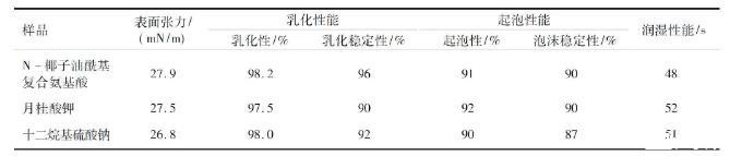 以大豆为原料合成的N-椰子油酰基复合氨基酸表面活性剂表面张力、乳化起泡润湿性能测定(二)