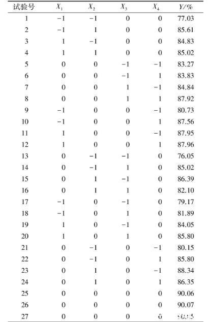 以单因素试验为基础,固定反应时间为2 h,以N-椰子油酰基复合氨基酸产率为响应值(Y),复合氨基酸溶液与椰油酰氯体积比(X1)、pH(X2)、反应温度(X3)、丙酮与复合氨基酸溶液体积比(X4)为影响因素,根据Box-Behnken的试验设计原理,通过SAS软件对试验数据进行回归分析,确定最佳工艺。响应面试验因素水平见表1,响应面试验方案及结果见表2,回归方程方差分析见表3。