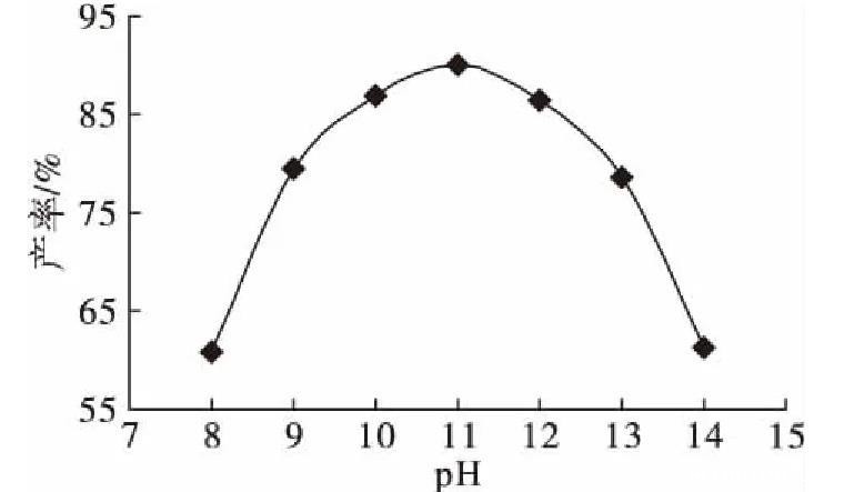 由图2可以看出,pH影响产率的总体趋势是首先逐步提高,达到最大值后逐步下降,pH为11时产物产率最大。因此,选择pH 10~12进行优化试验。