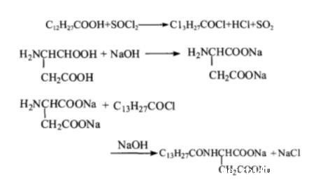 前两步反应为中间体的制备,最后一步为最终产物的制备。该反应属于SN2取代反应,在发生酰胺化反应的同时,十四酰氯很容易水解,十四酰氯与天冬氨酸钠也容易发生成酐反应,这是此反应的副反应。