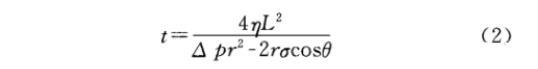 从式(1)可以看出,助排剂的表/界面张力越低,岩石越接近中性润湿,则毛细管力越小,越有利于返排。另外,根据Poiseulle方程,当排驱压差为△p(MPa)时,从半径为r(m),长为L(m)的毛细管中排出黏度为η(mPa·s),表面张力为σ(mN/m)和接触角为θ(°)的液体所需时间t(s)的表达式为: