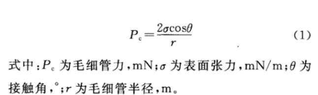 式中:Pc为毛细管力,mN;σ为表面张力,mN/m;θ为接触角,°;r为毛细管半径,m。