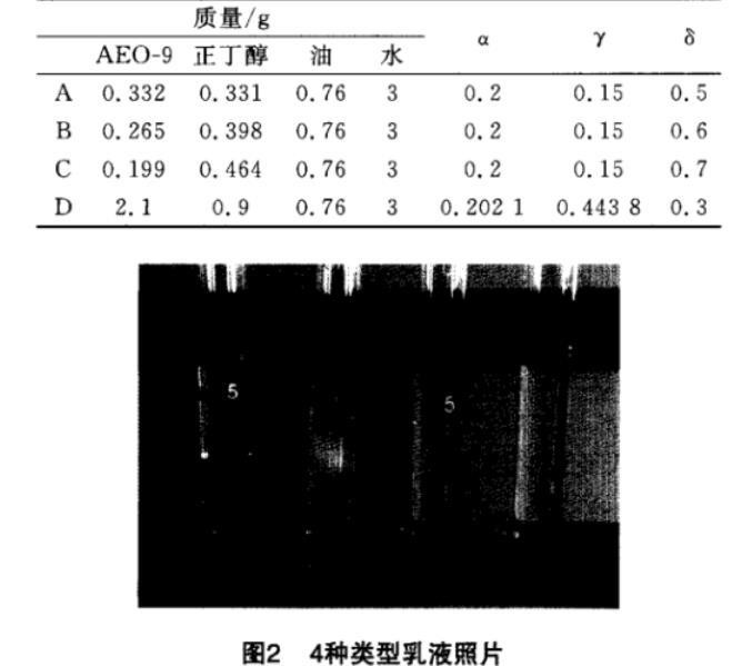 四组分体系水(W)+油(O)+表面活性剂(S)+醇(A)中,α为油在二元体系水+油中的质量分数,表示为α=O/(W+O);δ为醇在混合表面活性剂中的质量分数,即δ=A/(S+A);γ为混合表面活性剂在整个体系中的质量分数,即γ=(S+A)/(W+O+S+A)。通过变换α、γ、δ值,配制不同组成的乳液,静置后记录各乳液的相行为,绘制成鱼形相图。