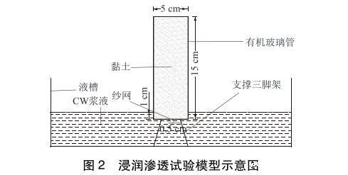 浸润渗透试验模型如图2所示,主要由液槽、支撑三脚架和透明有机玻璃管组成。有机玻璃管直径5cm,高15cm,顶端敞开,底部封闭钻有直径0.5cm的进浆孔。试验时将黏土装入有机玻璃管中,振捣压实,底部开孔处垫有纱网,防止土体掉落。将有机玻璃管和支撑三脚架放入浆液槽内,有机玻璃管底部浸入浆液液面以下1.0cm,使浆液从底部渗入黏土中,通过观察浆液在不同时间的渗透高度来评价浆液的浸润渗透效果。