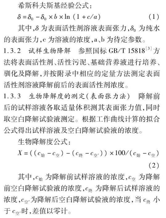 降解前后的试样溶液各取适量体积测其表面张力值,同时取空白降解试验液测定。根据工作曲线计算的拟合公式得出试样溶液及空白降解试验液的浓度。