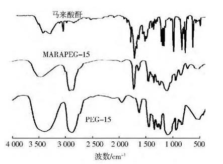 在MARAPEG-15曲线中,不存在酸酐中羰基C═O对称和反对称偶合振动吸收峰(1 783,1 856cm-1)以及C—O—C伸缩振动特征峰(1 268cm-1),也不存在羧酸的—OH的伸缩振动峰(3 000cm-1)以及共轭羧酸C═O的特征峰(1 620cm-1),不存在蓖麻油酸中仲羟基特征峰(1 124cm-1),而存在与羰基共轭的C═C特征峰1 643cm-1,说明马来酸酐与蓖麻油酸上的仲羟基进行了酯化反应。1 732cm-1处为蓖麻油酸的酯羰基的伸缩振动峰,3 460cm-1处为醇羟基—OH特征峰,1 249cm-1处为伯醇的C—O伸缩振动峰,2 925cm-1处为甲基、亚甲基伸缩振动峰,1 111cm-1处为聚乙二醇中的醚键特征峰。以上分析说明产物结构为MARAPEG-15。