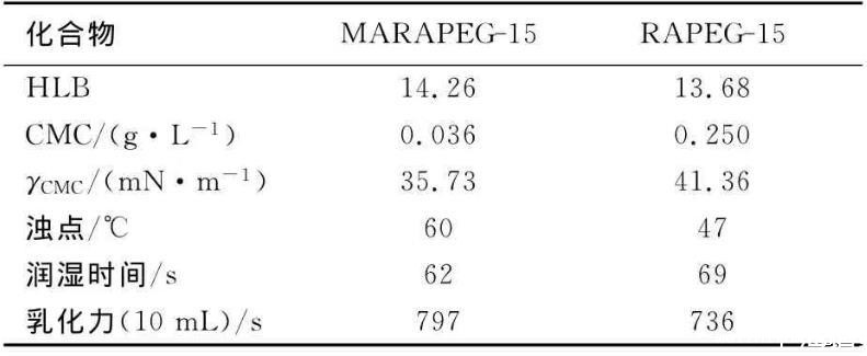 b.对MARAPEG-15和RAPEG-15的表面性能进行了测定与比较。MARAPEG-15的表面性能优于其单酯产品RAPEG-15,其表面张力及临界胶束浓度较低,乳化性能和润湿性能优良,可作为水包油型乳化剂。