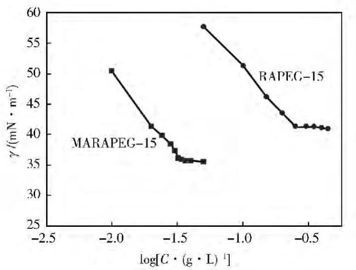 由图2可以看出:MARAPEG-15的表面张力低于RAPEG-15的表面张力,而且当达到表面张力的曲线拐点时,发现MARAPEG-15的临界胶束浓度也低于RAPEG-15的临界胶束浓度。