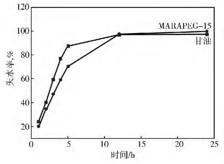由图3可以看出:MARAPEG-15的质量随时间增加不是十分明显,说明Gemini非离子表面活性剂MARAPEG-15吸水性能不理想,而甘油质量随时间增加较明显,表明吸湿性能不及甘油。由图4可以看出:在前10h,MARAPEG-15的保湿性能比甘油略差,而24h后,MARAPEG-15的保湿性能与甘油基本相同。