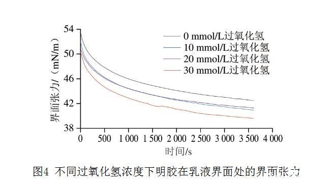 两亲性蛋白质促进蛋白质吸附到油-水界面并降低油相和水相之间的界面张力,从而形成稳定的界面层。如图4所示,氧化组的明胶界面张力均低于对照组,这表明所有明胶样品均具有表面活性。明胶在油-水界面处的界面张力随着过氧化氢浓度的增加而降低。不同过氧化氢浓度下明胶的界面张力随时间的延长逐渐降低,从未氧化组的53.8 mN/m下降到30 mmol/L组的50.7 mN/m。界面张力随着吸附时间的延长而降低,下降速率逐渐减小,这反映了蛋白质在界面上的吸附和覆盖。明胶界面张力的下降与其更好的两亲性有关。因此,在本研究中氧化导致明胶水接触角的增加,提高了明胶的疏水性并改善了明胶的两亲性,增加了蛋白质向油-水界面的吸附,这可能引起油-水界面张力的下降。Feng Xin等支持这一观点并报道,在猪皮明胶的提取过程中提高提取温度也会引起界面张力的降低,并认为随着提取温度的升高会破坏明胶原有的三螺旋结构,从而暴露出更多的疏水基团,这促使明胶分子能够更快地吸附到油-水界面上,从而更大程度地降低界面张力。