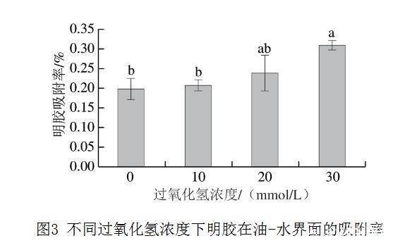 如图3所示,乳液中油-水界面的明胶吸附率随着过氧化氢浓度的增加而增加,从对照组的19.8%增加到30 mmol/L过氧化氢组的30.9%,增加1 倍左右,这表明更多氧化明胶分子吸附到油-水界面。Chen Jiahui等对肌原纤维蛋白进行超声处理,发现超声处理改变了肌原纤维蛋白的结构,从而有利于形成尺寸更小、更灵活的聚集体,促进蛋白质在油-水界面的吸附,减少油-水界面的界面张力。在米糠蛋白的氧化中也观察到类似的现象。氧化导致米糠蛋白中暴露出更多的疏水基团,促进了蛋白质在油-水界面的吸附,形成黏弹性膜,降低界面张力,使液滴分裂成更小的尺寸。相似地,Zou Heinan等利用高强度超声处理减小了贻贝肌浆蛋白的尺寸并增强了其表面疏水性,从而增加了蛋白质在油-水界面的吸附。