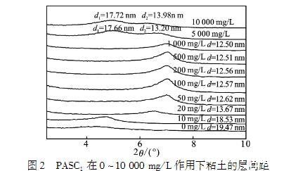 (2)PASC1的插层改变了粘土的层间距,当浓度达到1000mg/L时,层间距d达到最小。