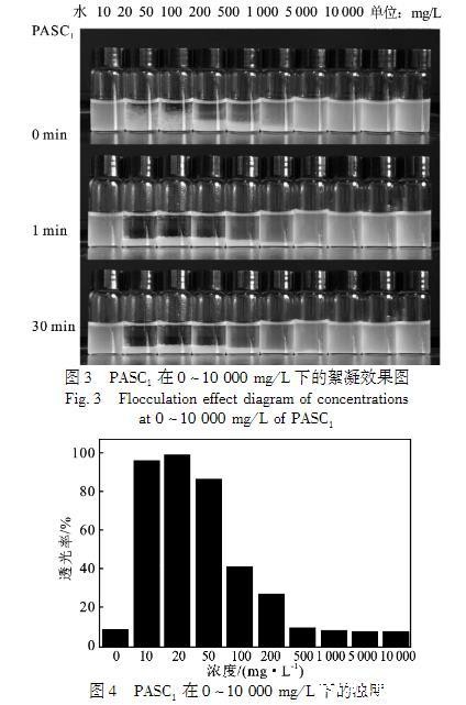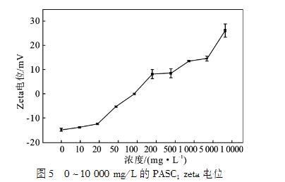 PASC1的絮凝效果见图3、图4.PASC1浓度为10——50mg/L时,透过率接近100%,继续增加PASC1的浓度,体系重新变得浑浊。随着PASC1浓度的进一步增加,体系的透过率降低,粘土颗粒悬浮体系重新稳定。粘土颗粒的表面由于同构取代而带负电荷,这意味着需要阳离子达到电荷平衡。对于钠基膨润土(Na——BT),Na+离子被吸引到层空间中。当Na——BT与水接触时,水可进入晶层内部,使可交换阳离子解离,在晶层表面建立扩散双电层,从而产生负电性。