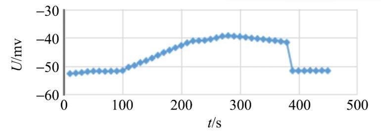 金属吊环这一运动过程中电压值也趋于平稳,对应于图2中380~450 s这一时间段的变化曲线.