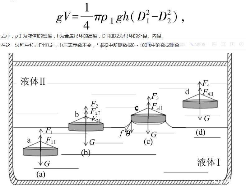 金属吊环全部浸没在液体Ⅰ中如图3(a)位置所示,此时吊环受到3个力的作用:吊环自身的重力G、液体Ⅰ对吊环的浮力F1Ⅰ以及拉力F1.在这3个力的作用下金属吊环在液体Ⅰ中匀速上升,力平衡方程为